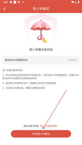 4、在青少年模式設(shè)置頁(yè)面點(diǎn)擊開啟青少年模式,進(jìn)入設(shè)置密碼頁(yè)面。