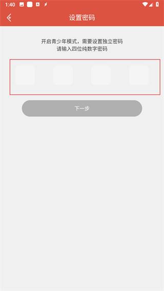 5、在設(shè)置密碼頁(yè)面輸入四位純數(shù)字密碼,即可開啟青少年模式。