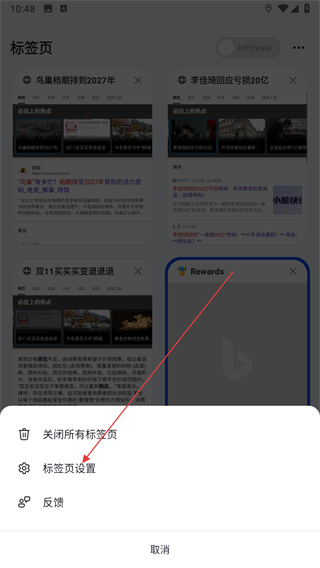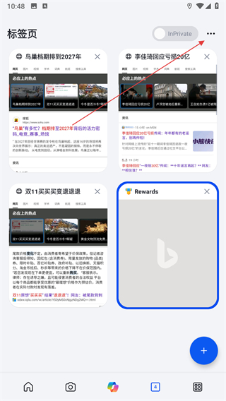 1、打開必應(yīng)搜索應(yīng)用,在標(biāo)簽頁界面點(diǎn)擊右上角的三點(diǎn)圖標(biāo)。