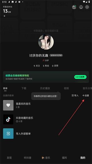2、進(jìn)入我的頁面內(nèi),在歌單右側(cè)點(diǎn)擊+創(chuàng)建的功能按鈕。