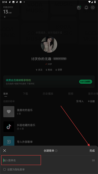 3、輸入歌單名稱后,再點(diǎn)擊完成的按鈕即可創(chuàng)建成功。
