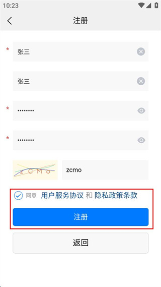 3、勾選同意“用戶(hù)服務(wù)協(xié)議和隱私政策條款”,點(diǎn)擊“注冊(cè)”按鈕。