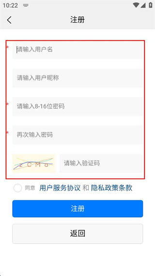 2、在注冊(cè)頁(yè)面依次輸入用戶(hù)名、用戶(hù)昵稱(chēng)、8-16位密碼、再次輸入密碼及驗(yàn)證碼。