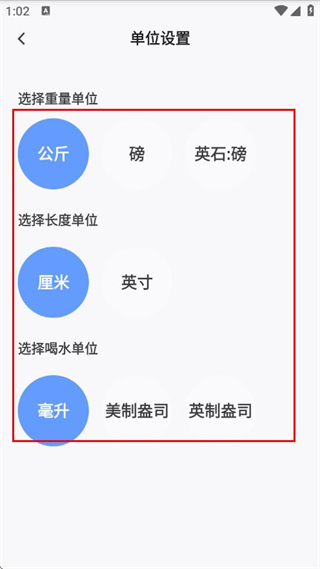 3、在單位設(shè)置頁面可分別選擇重量單位、長度單位和喝水單位。