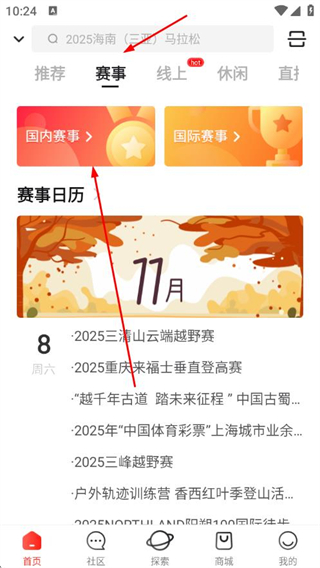 1、打開馬拉馬拉APP,點(diǎn)擊賽事選項(xiàng),進(jìn)入賽事頁面后點(diǎn)擊國內(nèi)賽事。