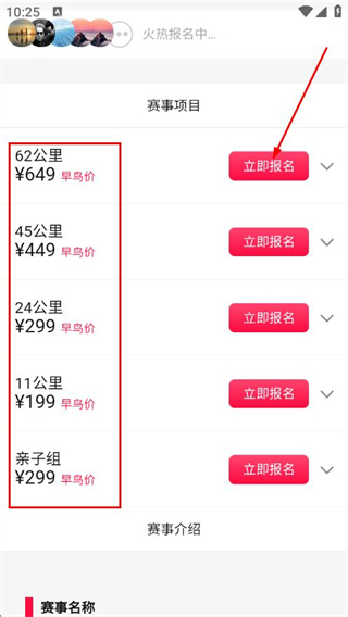 3、在賽事項(xiàng)目頁面選擇參賽項(xiàng)目,點(diǎn)擊立即報(bào)名按鈕,完成報(bào)名。