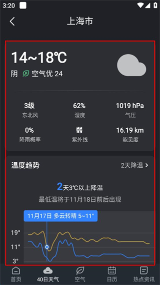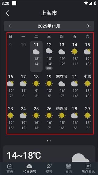 3、在40日天氣日歷中,可查看上海2025年11月每日的天氣及溫度情況。