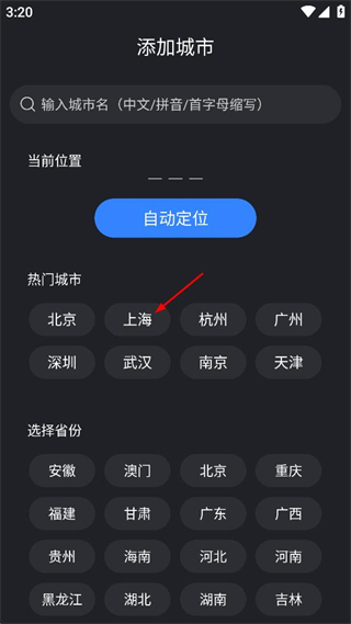 1、在添加城市頁面,點(diǎn)擊熱門城市中的上海,添加上海為目標(biāo)城市。