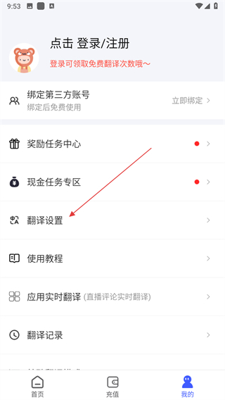 1、打開游戲翻譯助手APP,點擊翻譯設置選項。