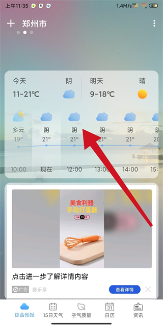 4、選擇城市后,即可查看該城市的天氣信息如鄭州市今天陰,11~21℃。