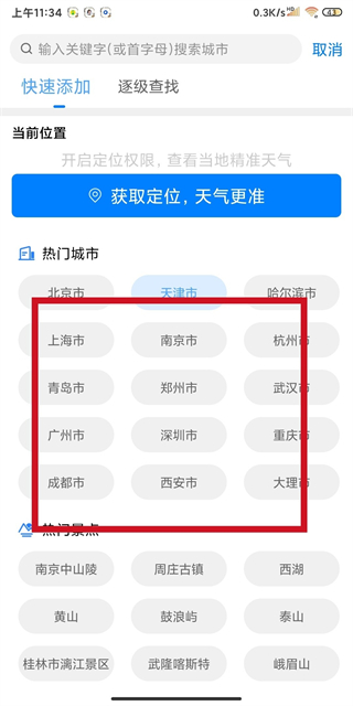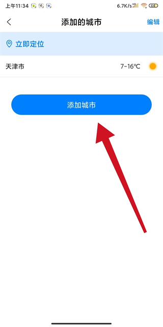 2、在添加城市頁面點擊添加城市,進入城市選擇頁面。