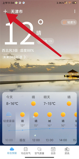 1、打開天氣類APP,點擊左上角加號圖標,進入添加城市頁面。
