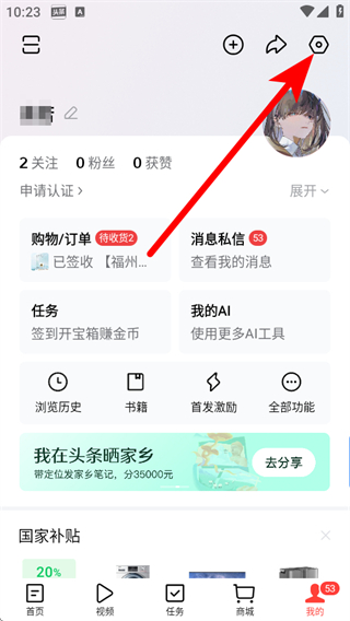 2、在個人頁面中,點擊右上角的設(shè)置圖標(biāo),進入設(shè)置頁面。