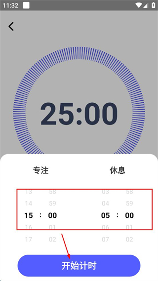 3、設(shè)置專注時間為15:00,休息時間為05:00,點擊“開始計時”按鈕。
