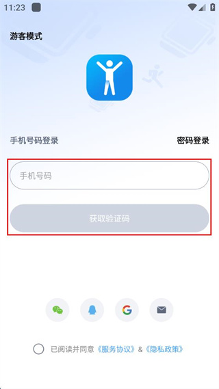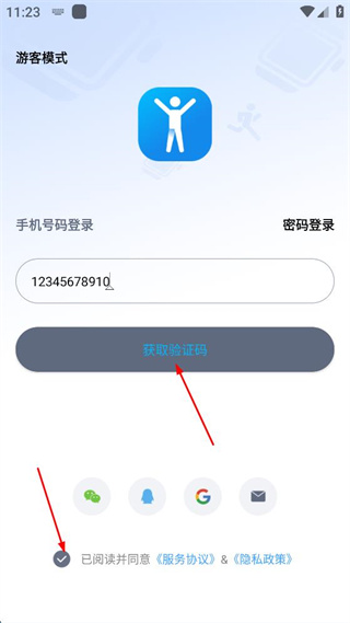 4、勾選同意服務(wù)協(xié)議和隱私政策,點(diǎn)擊獲取驗證碼按鈕,完成登錄準(zhǔn)備操作。