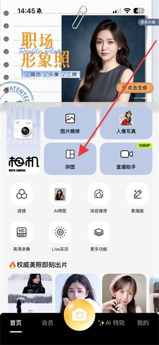 1、打開無他相機(jī)APP,在首頁找到拼圖選項(xiàng)并點(diǎn)擊,進(jìn)入圖片選擇頁面。