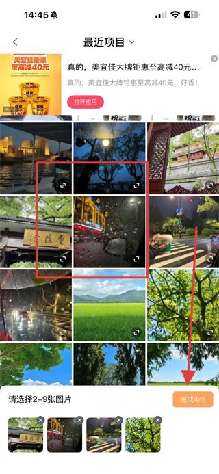 2、在圖片選擇頁面選擇2-9張要拼圖的照片,點(diǎn)擊完成,進(jìn)入拼圖樣式選擇頁面。