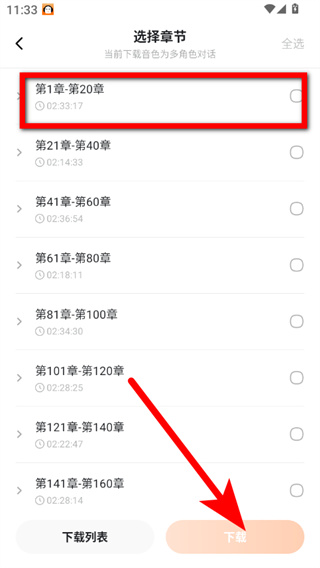 2、在作品詳情界面,點擊下載選項,進入選擇章節(jié)頁面。