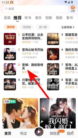 2、搜索完成后,在結(jié)果列表里定位到目標(biāo)內(nèi)容如前女友母親懷上雙胞胎,她急哭了,瀏覽聽書榜、音樂榜等分類下的相關(guān)推薦。