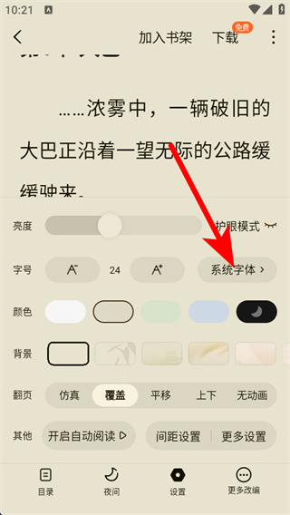 2、在小說(shuō)內(nèi)容界面,點(diǎn)擊下方設(shè)置選項(xiàng),進(jìn)入設(shè)置頁(yè)面。