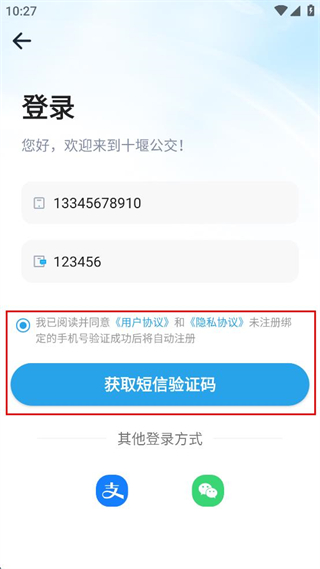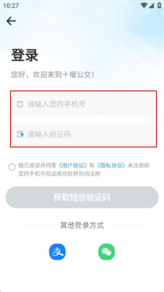 3、在登錄界面輸入手機號和驗證碼,勾選用戶協(xié)議和隱私協(xié)議。