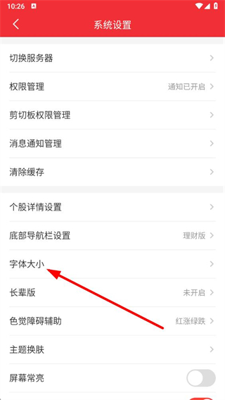 3、在系統(tǒng)設置頁面,點擊字體大小選項,進入字體大小設置頁面。