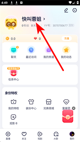 2、在我的頁面中,點擊昵稱區(qū)域進入個人主頁。