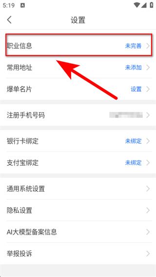 4、在設置頁面,點擊職業(yè)信息,按照提示填寫相關職業(yè)信息。
