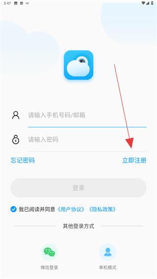 1、打開喬安智聯(lián)監(jiān)控的APP,進(jìn)入時(shí)點(diǎn)擊立即注冊的按鈕。