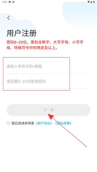 2、進(jìn)入用戶注冊的頁面內(nèi),輸入手機(jī)號、密碼點(diǎn)擊下一步。