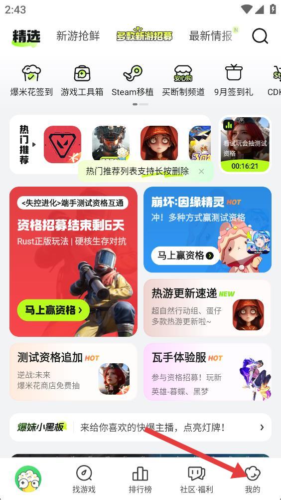 1、打開快爆手游App,點擊底部導(dǎo)航欄我的。