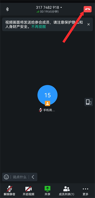 3、若需結(jié)束會(huì)議,點(diǎn)擊會(huì)議界面右上角的掛斷按鈕即可。