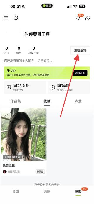 2、在個(gè)人頁(yè)面中,點(diǎn)擊頭像右側(cè)的編輯資料按鈕。