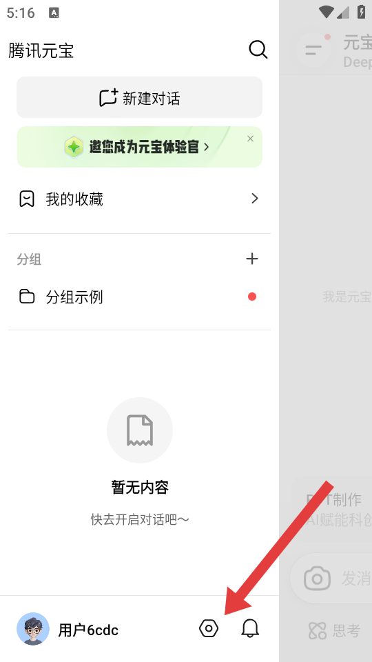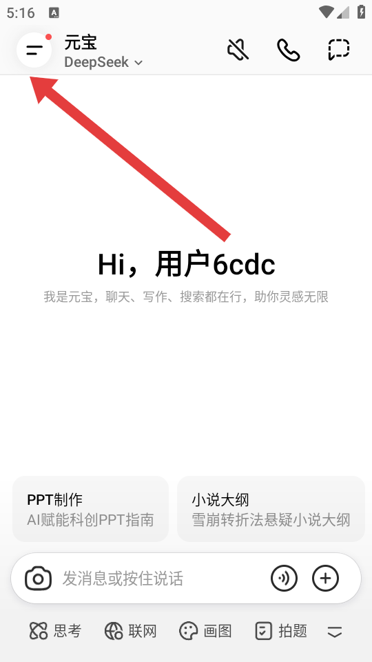 1、打開(kāi)騰訊元寶APP,點(diǎn)擊界面左上角的菜單按鈕,展開(kāi)側(cè)邊欄。