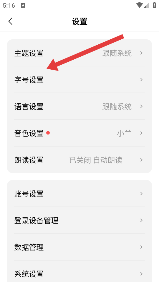 3、在設(shè)置的界面里,點(diǎn)擊字號(hào)設(shè)置選項(xiàng),進(jìn)入字號(hào)設(shè)置頁(yè)面。