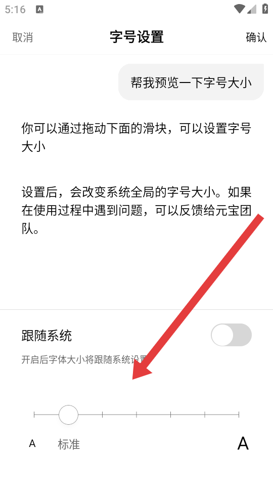 4、在字號(hào)設(shè)置頁(yè)面,拖動(dòng)滑塊調(diào)整大小,調(diào)整后點(diǎn)擊確認(rèn)即可完成設(shè)置。