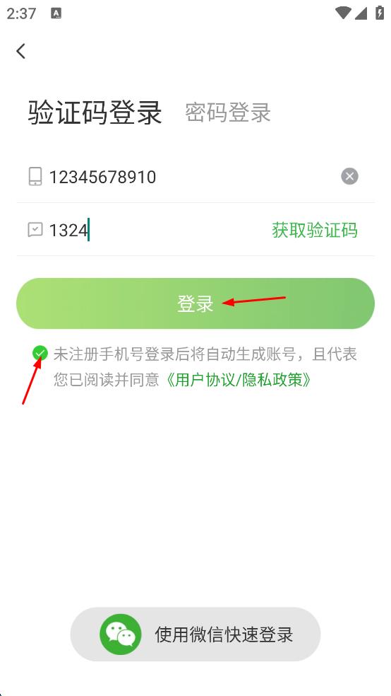 4、輸入收到的驗證碼,勾選未注冊手機號登錄后將自動生成賬號相關(guān)選項,點擊登錄按鈕。