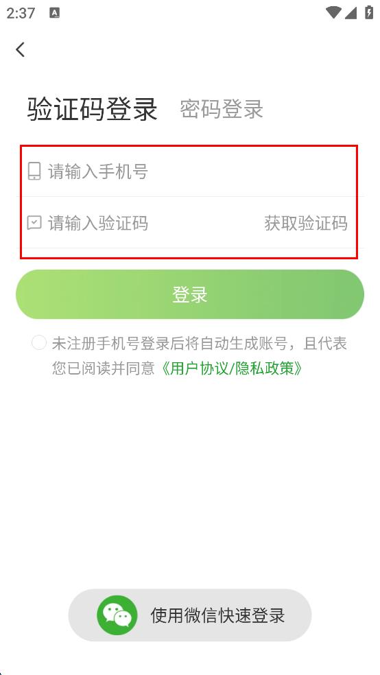 3、在登錄頁面,選擇驗證碼登錄,輸入手機號,點擊獲取驗證碼。