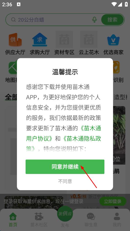 1、打開苗木通APP,出現(xiàn)溫馨提示彈窗,點擊同意并繼續(xù)按鈕。