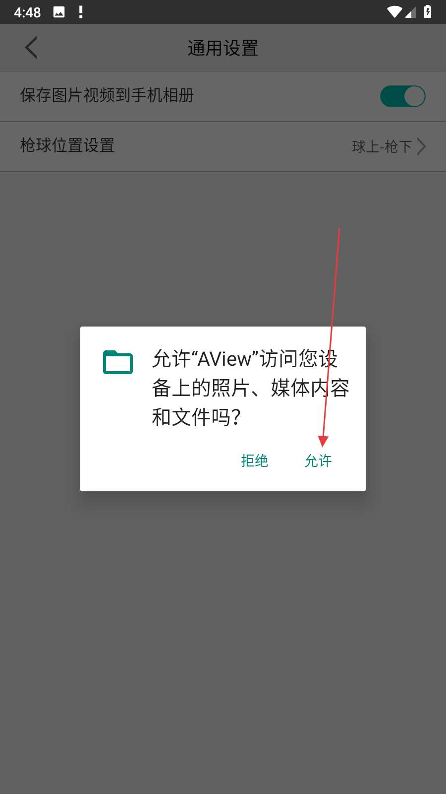 3、點(diǎn)擊開(kāi)關(guān)按鈕后會(huì)彈出權(quán)限請(qǐng)求框詢問(wèn)是否允許Aview訪問(wèn)設(shè)備照片媒體內(nèi)容和文件,點(diǎn)擊允許即可完成設(shè)置。