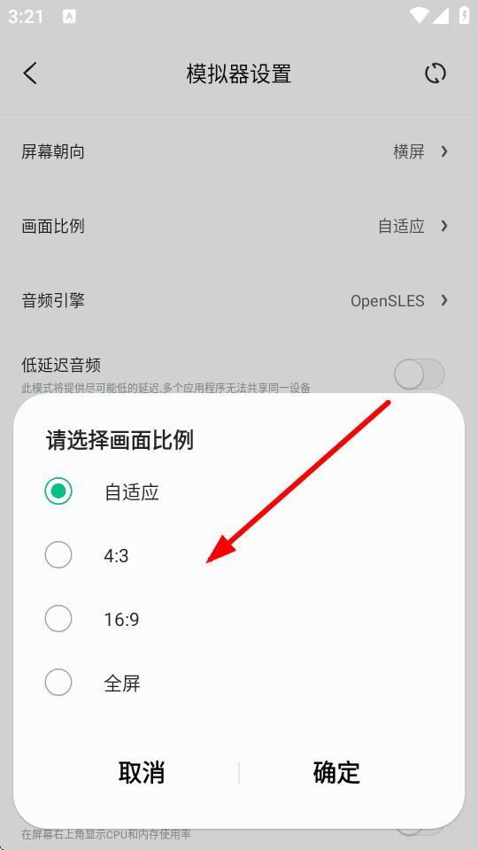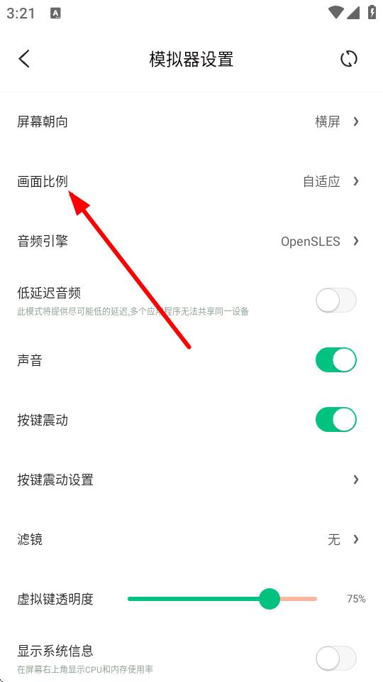 3、進(jìn)入模擬器設(shè)置界面后,找到畫面比例選項并點(diǎn)擊。