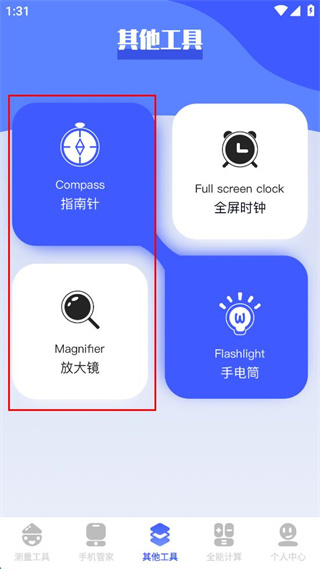 2、在其他工具界面,點(diǎn)擊“指南針”按鈕,進(jìn)入指南針界面。