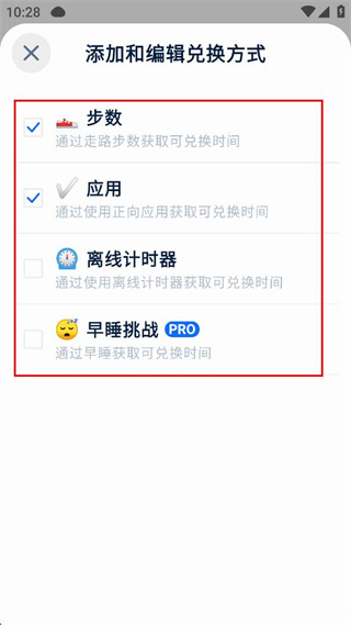 4、進入添加和編輯兌換方式頁面,可選擇步數、應用、離線計時器、早睡挑戰(zhàn)PRO等兌換方式。