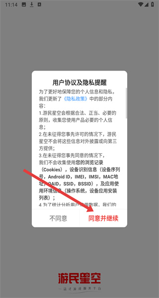 1、打開游民星空應(yīng)用后,彈出“用戶協(xié)議及隱私提醒”窗口,點擊同意并繼續(xù)按鈕進入。
