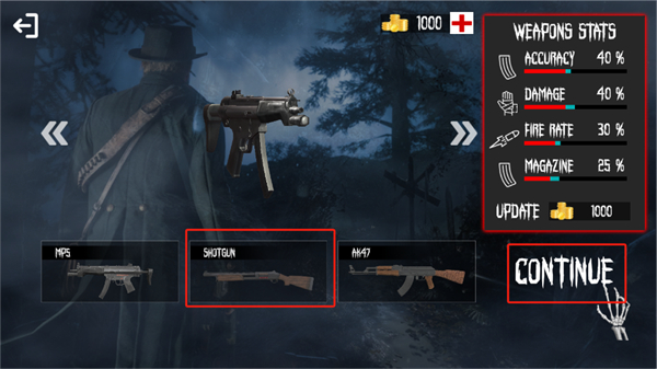 3、這時(shí)玩家將可以進(jìn)行槍支的選擇,可以選擇一把你喜歡的槍支,選擇好槍支之后,可以點(diǎn)擊右下角的【continue】按鈕,以進(jìn)入到戰(zhàn)斗射擊的場(chǎng)景內(nèi)去;