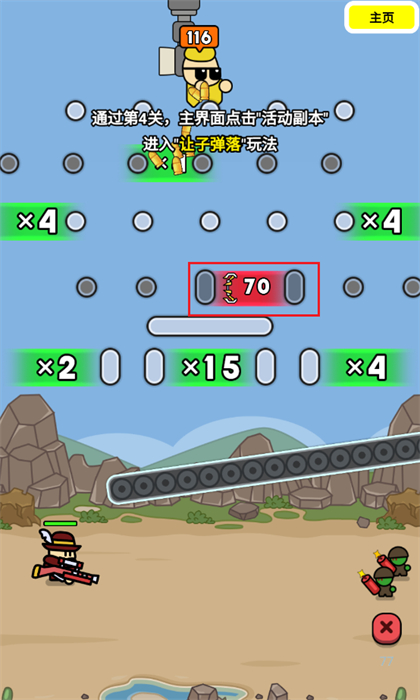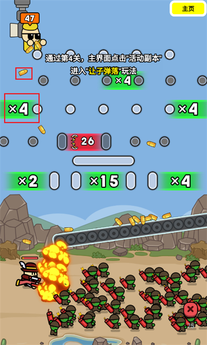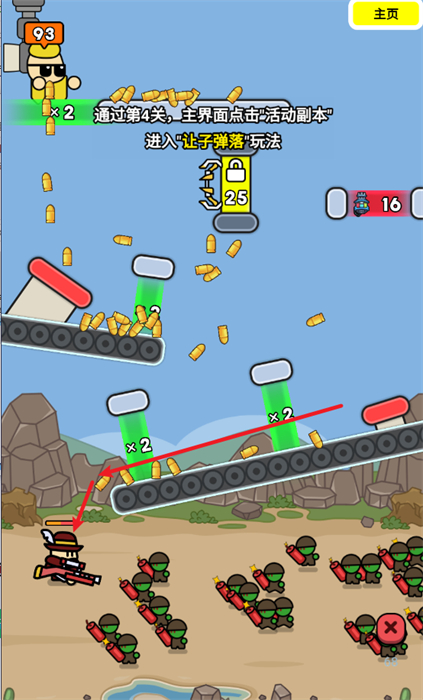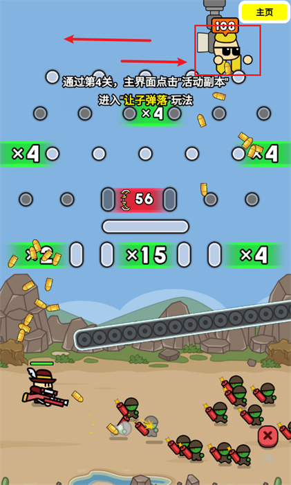2、此時(shí)玩家將會(huì)進(jìn)入到戰(zhàn)斗場(chǎng)景之中,需要不斷的滑動(dòng)屏幕上方的子彈派送小人,以確保小人能夠?qū)⒆訌椡渡涑鋈ィ?