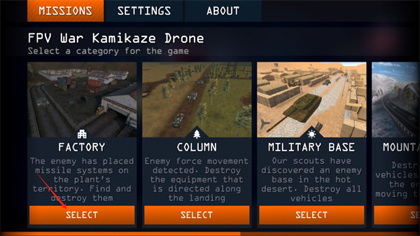 1、為自己選擇一個(gè)探索的場(chǎng)景中,這里設(shè)計(jì)了不同的軍事戰(zhàn)斗基地,荒廢、綠野、沙漠等敵軍展示基地下對(duì)抗,小編點(diǎn)擊第一個(gè)場(chǎng)景中的【SELECT】為例進(jìn)入這里進(jìn)行任務(wù)冒險(xiǎn);