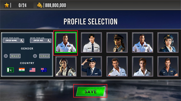 1、進(jìn)入到游戲的場(chǎng)景內(nèi)之后,玩家首先需要進(jìn)行飛行員的選擇,選擇好之后,需要點(diǎn)擊【save】按鈕;