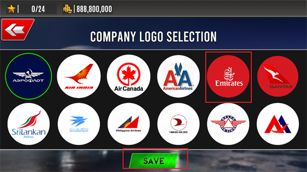 2、隨后玩家將需要進(jìn)行飛機(jī)公司的選擇,具有多種不同的飛機(jī)公司可供玩家們選擇,可以選擇一個(gè)你熟悉的公司,并點(diǎn)擊【save】按鈕;