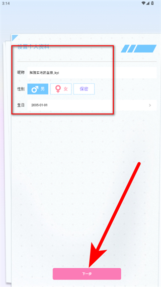 3.登錄后,設(shè)置個(gè)人資料如昵稱、性別、生日,點(diǎn)擊下一步。